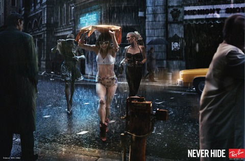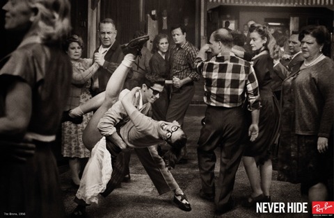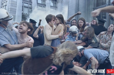 Thập niên 70: "John Lennon" - RB3447: Bức ảnh này có thể coi là tấm hình đặc biệt nhất trong chiến dịch huyền thoại Ray-Ban 2012. Chưa cần nhận dạng model kính huyền thoại mà hãy tập trung vào khung cảnh xung quanh. Hình ảnh các thanh niên đang kháng cự lại những cảnh sát có vũ trang gợi nhớ đến phong trào chống chiến tranh bạo lực tại Mỹ những năm cuối thập niên 60. Điều làm nên sự kịch tính của bức hình là cặp tình nhân trẻ đang trao nhau nụ hôn say đắm trong hoàn cảnh hỗn loạn. Sự đam mê, khao khát của họ chính là niềm tin bất diệt vào tình yêu và hòa bình trên toàn thế giới mà những thanh niên trẻ này đang đấu tranh.